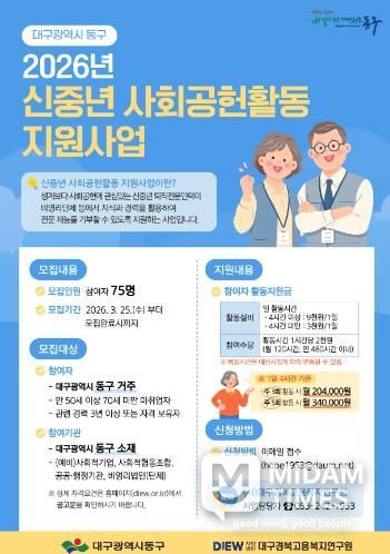 미담타임스 전해찬 기자 | 대구 동구청은 퇴직 전문 인력의 경험과 전문성을 활용해 지역사회에 기여 하는 ‘2026년도 신중년 사회공헌활동 지원사업’을 시행한다.