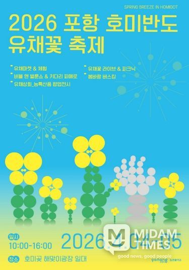 미담타임스 김준완 기자 | 노란 유채꽃 물결이 일렁이는 봄을 맞아 포항을 대표하는 봄꽃 행사인 ‘2026 포항 호미반도 유채꽃 축제’가 내달 4일부터 5일까지 이틀간 호미곶 해맞이광장에서 개최된다.