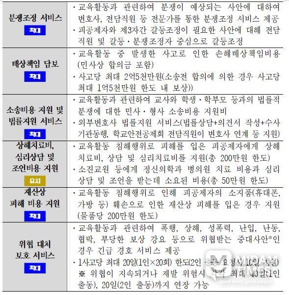 교육활동 침해로 인한 재산상 피해 지원 금액은 물품당 100만 원에서 200만 원까지 확대하고, 손해배상책임 보장 한도는 사고당 최대 2억 5,000만 원으로 상향한다.