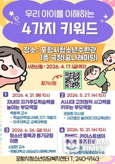 미담타임스 김준완 기자 | 포항시청소년재단 청소년상담복지센터는 올해 운영할 부모교육 주제를 ‘우리 아이를 이해하는 4가지 키워드’로 확정하고 오는 17일까지 참가자를 모집한다.