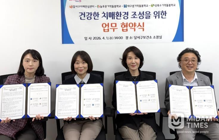 미담타임스 전해찬 기자 | 대구 달서구는 지난 1일 늘푸른기억돌봄학교, 대구샘기억돌봄학교, 상록수기억돌봄학교와 업무협약을 체결하고, 인지저하 및 경증치매 어르신을 위한 통합돌봄 체계 구축에 나선다.
