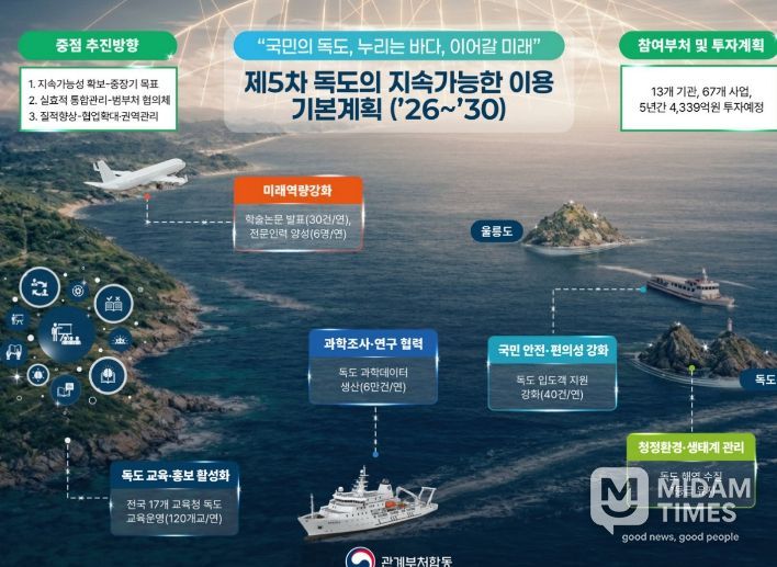 미담타임스 김준완 기자 | 경상북도는 정부가 발표한 ‘제5차 독도의 지속가능한 이용을 위한 기본계획’과 2026년 시행계획에 발맞춰 독도의 실질적 관리주체로서 현장중심의 정책을 본격 추진한다.
