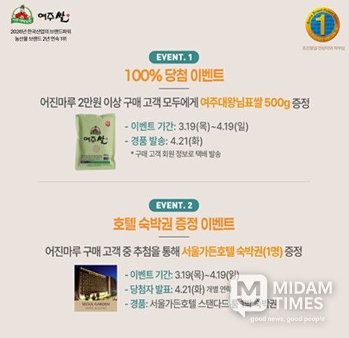 미담타임스 김준완 기자 | 여주시 농산업 공동브랜드 활성화센터는 오는 4월 19일까지 어진마루몰에서 여주쌀 2만 원 이상 구매 고객 전원에게 500g 쌀을 추가 증정하는 이벤트를 진행한다고 밝혔다.