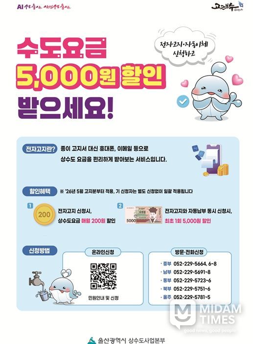미담타임스 김준완 기자 | 울산시 상수도사업본부는 시민들의 요금 납부 편의 증진과 종이고지서 사용 감축을 통한 친환경 행정 실현을 위해 오는 5월부터 상수도요금 전자고지 및 자동납부 신청자에게 요금 할인 혜택을 제공한다고 밝혔다.