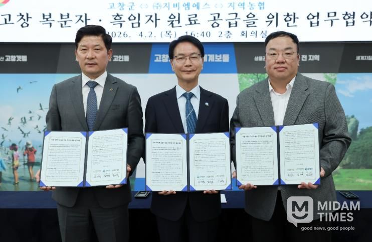 미담타임스 정인화 기자 | 고창군이 지난 2일 오후 군청2층 회의실에서 고창군·㈜지비엠에스·지역농협 5개소와 ‘고창 복분자·흑임자 원료 공급 및 상생발전 업무협약(MOU)’을 체결했다.