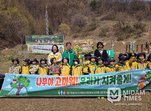 이날 현장에는 경북 영주시와 17개 유아교육기관 유아, 교사, 학부모 등 200여명이 참석해 낙엽송 100본을 정성껏 식재했다. 같은 시간 전국 1,232개 유아교육기관에서도 약 10만 명의 유아들이 나무 심기에 동참했다.