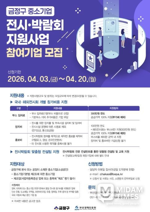 미담타임스 남혜영 기자 | 부산 금정구는 관내 중소기업의 판로 개척과 시장 경쟁력 강화를 위하여 ‘금정구 중소기업 전시박람회 참가 지원 사업’ 참여 기업을 오는 4월 20일까지 모집한다고 밝혔다.
