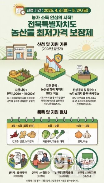 미담타임스 김준완 기자 | 전북특별자치도는 가격 변동성이 큰 농산물에 대한 경영안정 지원을 위해 ‘2026년 주요농산물 가격안정 지원사업’ 신청을 4월 6일부터 오는 5월 29일까지 접수한다.