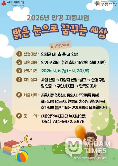 미담타임스 김준완 기자 | (재)영덕복지재단은 시력 교정이 필요함에도 경제적 어려움으로 안경을 구매하지 못하는 관내 취약 아동‧청소년을 지원하기 위해 6일부터 안경 지원 사업을 펼친다.