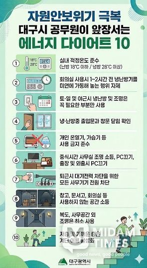 미담타임스 전해찬 기자 | 대구광역시는 최근 중동 지역 분쟁으로 국제 유가와 에너지 수급 불안정성이 확대되고, 4월 8일부로 자원안보위기 ‘경계’ 단계가 발령됨에 따라 시민 생활 안정과 에너지절약을 위한 선도적 대응 조치로 ‘공직자 승용차 2부제’를 4월 8일부터 시행한다.