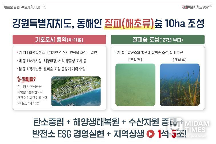 미담타임스 김준완 기자 | 강원특별자치도는 동해안 해역에 해양 탄소흡수원인 ‘잘피숲’ 10ha 조성을 추진하기 위해 기초조사에 착수한다.