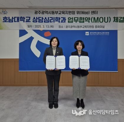 미담타임즈 박민정 기자 | 광주동부교육지원청 동부위(Wee)센터는 13일 교육지원청 중회의실에서 호남대학교 상담심리학과와 ‘마음 꿈키움 멘토링 사업’에 대한 업무협약(MOU)을 체결했다.