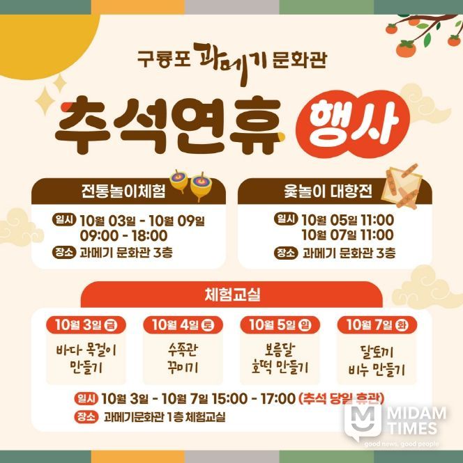 이번 행사는 가족 단위 방문객들에게 전통문화와 체험학습의 기회를 제공하고, 구룡포과메기문화관이 지역민과 관광객이 함께 어울리는 명절 문화공간으로 자리매김하는 계기가 될 것으로 기대된다.