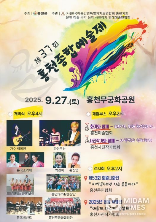 미담타임스 정인화 기자 | 홍천군이 주최하고 (사)한국예총홍천지회(회장 백금산)와 산하 6개 지부(문인, 미술, 국악, 음악, 사진작가, 연예예술인협회)가 주관하는 '제37회 홍천종합예술제'가 오는 9월 27일 오후 4시 홍천무궁화공원에서 성대하게 개막한다.