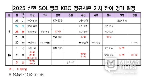 미담타임스 박민정 기자 | KBO는 26일(금) 2025 신한 SOL뱅크 KBO 정규시즌 2차 잔여 경기 일정을 확정했다.
