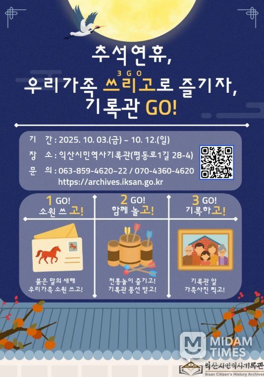 익산시는 추석을 맞아 오는 10월 3일부터 12일까지 시민역사기록관에서 '추석연휴, 우리가족 쓰리고로 즐기자, 기록관 고(Go)'를 운영한다고 29일 밝혔다.