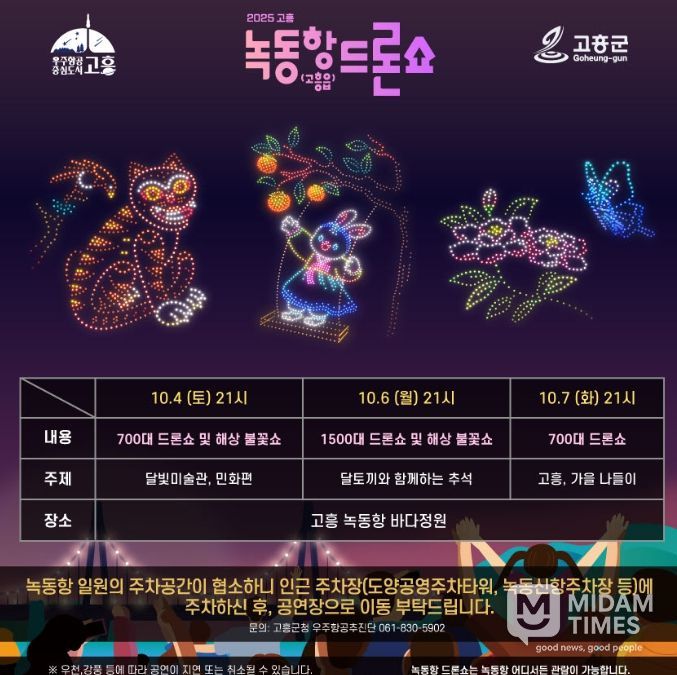 미담타임스 정인화 기자 | 고흥군은 민족 대명절 추석을 맞아 오는 10월 4일, 6일, 7일 3일간 녹동항 바다정원 일원에서 드론쇼 및 해상불꽃쇼를 개최한다고 밝혔다.