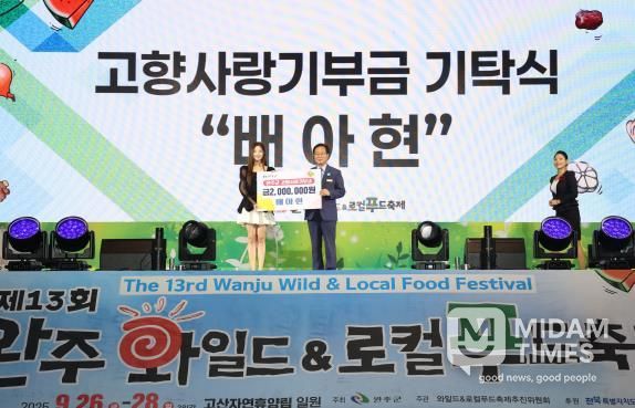 미담타임스 정인화 기자 | 완주군 고향사랑기부제 홍보대사인 트로트 가수 배아현 씨가 지난 26일 완주 와일드&로컬푸드축제 현장에서 기탁식을 열고 200만 원을 기부하며 따뜻한 나눔을 실천했다.