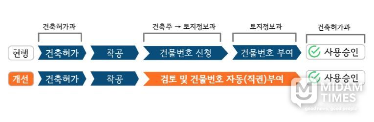 그동안 건축주는 건물 신축 시 건축법에 따라 건축 담당 부서에 착공신고를 한 후 도로명주소법에 따라 주소 담당 부서에 건물번호 부여를 별도로 신청해야 했다.