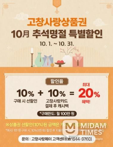미담타임스 정인화 기자 | 고창군이 추석을 맞아 군민 생활안정과 지역경제 활성화를 위해 ‘고창사랑상품권 특별할인 행사’를 진행한다. 이번 행사는 10월 한 달간 진행된다.