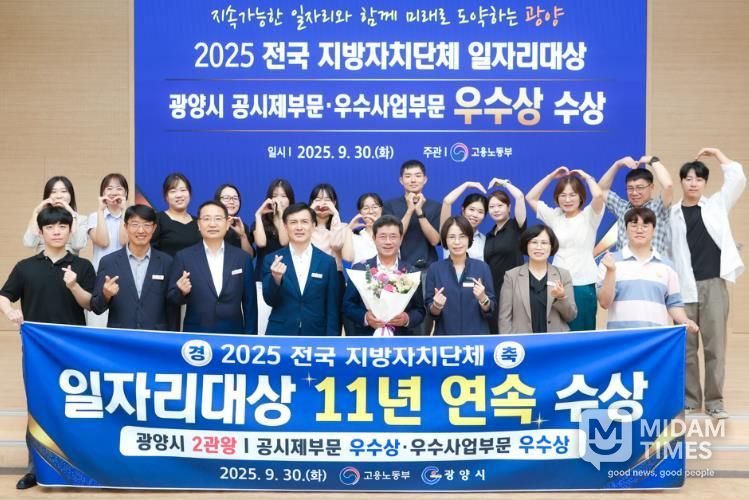 미담타임스 정인화 기자 | 광양시는 9월 30일 청주 오스코에서 열린 고용노동부 주관 '2025년 전국 지방자치단체 일자리대상' 시상식에서 공시제 부문과 우수사업 부문 모두 우수상을 수상하며, 2015년부터 11년 연속 수상이라는 값진 성과를 거뒀다고 밝혔다.
