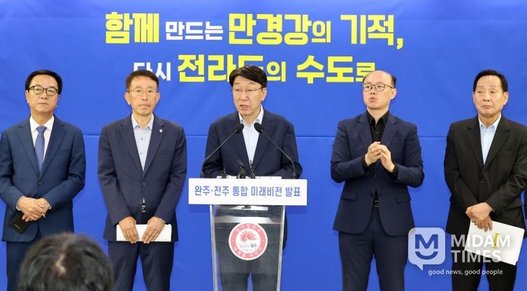 우범기 전주시장은 30일 시청 4층 회의실에서 ‘완주-전주 통합시 비전 발표 기자회견’을 열고 “지방 소멸의 절박한 위기 앞에서 완전(完全)한 도시, 완전(完全)한 미래로 나아가기 위한 완주·전주 통합의 염원이 날로 뜨겁고 깊어지고 있다”라며 “완주와 전주가 하나된 힘으로 함께 미래를 그리고 함께 미래로 나아간다면, 한강의 기적을 뛰어넘는 만경강의 기적을 만들 수 있을 것”이라고 밝혔다.