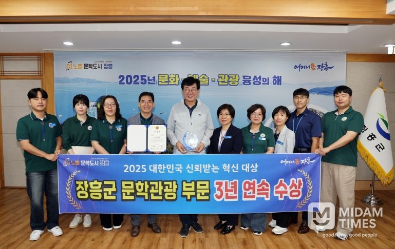 미담타임스 정인화 기자 | 장흥군이 9월 29일 개최한 ‘2025 대한민국 신뢰받는 혁신대상’시상식에서 문학관광 부문 공공혁신 대상을 수상했다고 밝혔다.