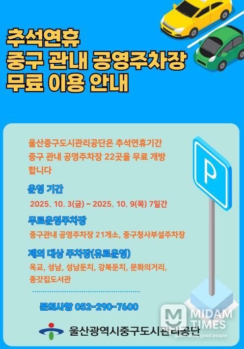 미담타임스 김준완 기자 | 울산중구도시관리공단이 추석 연휴인 10월 3일부터 10월 9일까지 중구 지역 공영주차장 22곳을 무료로 운영한다.