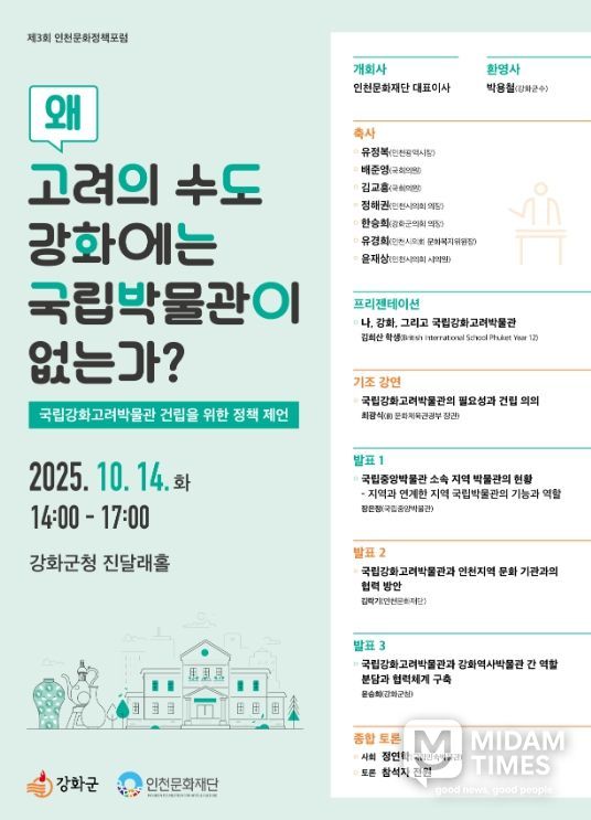 미담타임스 정주환 기자 | 강화군은 오는 14일 강화군청에서 ‘고려의 수도 강화에는 국립박물관이 없는가?’를 주제로 정책 포럼을 개최한다고 밝혔다.