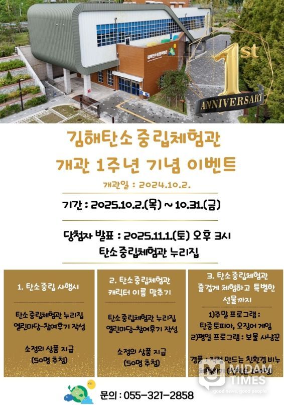 미담타임스 김준완 기자 | 김해시는 김해탄소중립체험관 개관 1주년을 맞아 2일부터 31일까지 한 달간 특별 기념 이벤트를 운영한다. 이번 이벤트는 온라인과 오프라인 어디든 자유롭게 참여할 수 있다.