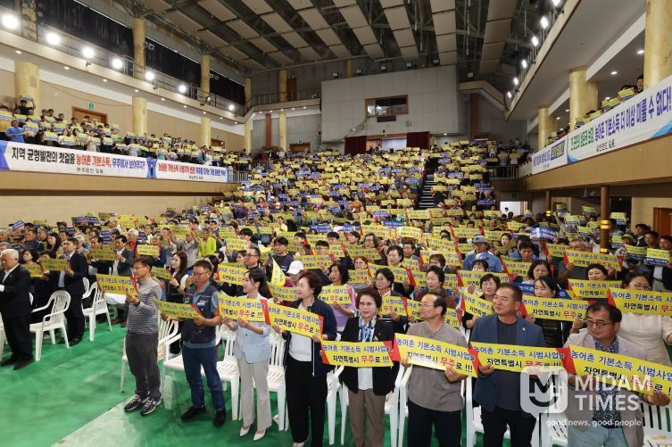 미담타임스 정인화 기자 | 무주군이 지난 1일 무주예체문화관 대강당에서 농어촌 기본소득 시범사업 선정을 촉구하는 범군민 결의대회를 개최했다.