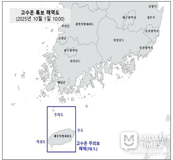 미담타임스 김준완 기자 | 해양수산부는 10월 1일 16시부터 고수온 위기경보를 전면 해제하고, 적조 위기경보도 ‘주의’에서 ‘관심’ 단계로 하향했다고 밝혔다.