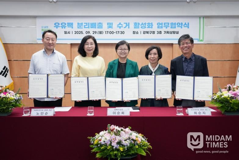 미담타임스 정주환 기자 | 서울 강북구는 9월 29일(월) 구청 기획상황실에서 강북구어린이집연합회와 어진이마을관리 사회적협동조합과 함께 우유팩 분리배출 및 수거 활성화 기반 구축을 위한 업무협약을 체결했다고 밝혔다.