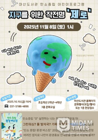 미담타임스 김준완 기자 | 김포시 마산도서관에서 오는 11월 8일 오후 1시부터 3시까지, 초등학교 2학년~4학년 어린이를 대상으로 탄소중립 어린이 프로그램 책풍당당 '지구를 위한 작전명 ‘제로’'를 운영한다.