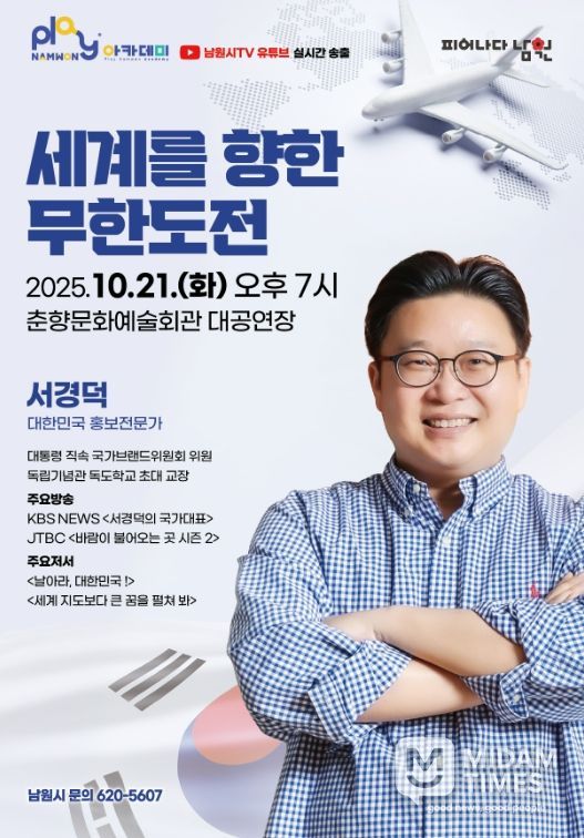 미담타임스 정인화 기자 | 남원시는 오는 21일 오후 7시, 춘향문화예술회관 대공연장에서 대한민국 홍보 전문가 서경덕 교수를 초청해 “세계를 향한 무한도전”이라는 주제로 플레이(Play) 남원 아카데미를 개최한다.