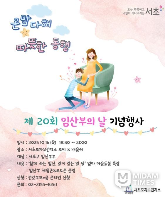 미담타임스 정주환 기자 | 서울 서초구는 제20회 임산부의 날(10.10.)을 맞아 16일 오후 6시 30분부터 9시까지 서초보건지소에서 ‘온맘다해, 따뜻한 동행’을 주제로 기념행사를 개최한다고 밝혔다.