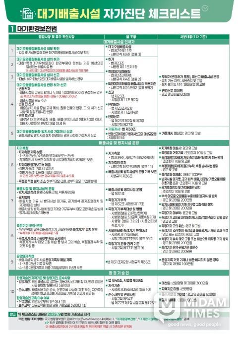 이번에 배포된 점검표는 사업장이 스스로 오염물질 배출시설 및 방지시설 운영 전반을 점검할 수 있도록 구성됐으며 배출시설 허가·신고 사항, 자가측정 이행 여부, 방지시설 정상 가동, 측정기기 부착·운영 상태, 환경기술인 선임 및 교육 이수 여부 등 12개 주요 항목과 세부 점검 사항이 담겨 있다.