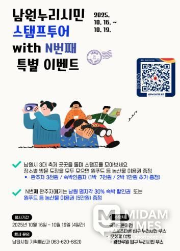 이와 함께 남원누리시민 15만명 돌파 기념 이벤트로 n번째 완주자 20명에게 12월 31일까지 사용할 수 있는 ‘명지각 숙소 30% 모바일 할인쿠폰’ 및 농산품 이용권을 추가 증정하여 재방문을 유도하고 스탬프투어 참여 열기를 높일 계획이다.