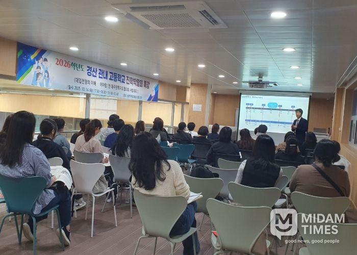 미담타임스 김준완 기자 | 경상북도경산교육지원청은 2025년 10월 14일 남부미래교육관에서 ‘2026학년도 경산 관내 고등학교 진학박람회’를 성황리에 개최했다. 이번 행사에는 중학교 3학년 학생과 학부모 등 200여 명이 참석해 높은 관심을 보였다.