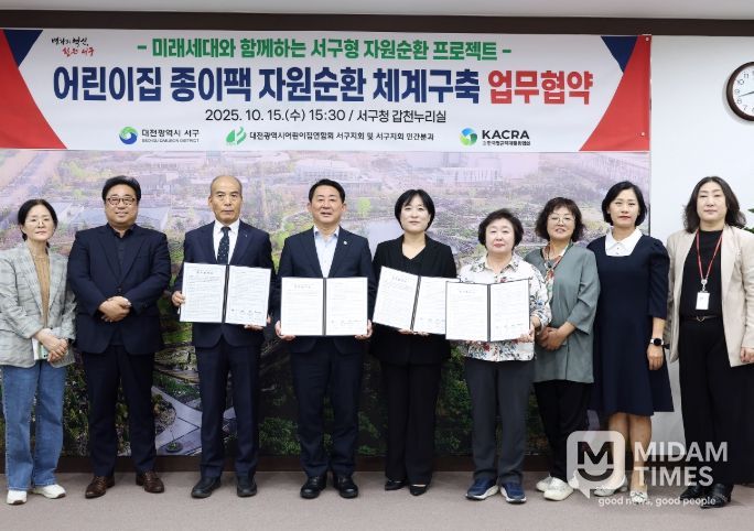 미담타임스 김준완 기자 | 대전 서구는 대전어린이집연합회 서구지회 및 민간분과, (사)한국멸균팩재활용협회와 ‘어린이집 종이팩 자원순환체계 구축을 위한 업무협약’을 체결했다고 16일 전했다.