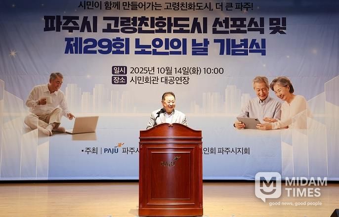미담타임스 정주환 기자 | 파주시는 지난 14일 파주시민회관 대공연장에서 ‘제29회 노인의 날 기념행사 및 세계보건기구(WHO) 인증 고령친화도시 선포식’을 성황리에 개최하고, 고령사회에 대응하는 파주시 복지정책 방향과 세대 간 공감의 문화를 확산하기 위한 뜻깊은 자리를 마련했다.