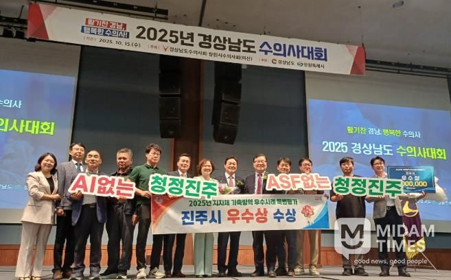 미담타임스 김준완 기자 | 진주시가 지난 15일 창원컨벤션센터에서 개최된 ‘2025년 경상남도 수의사대회’에서 ‘가축방역 우수 기관상’을 수상했다.