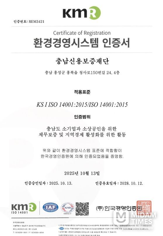 미담타임스 김준완 기자 | 충남신용보증재단은 한국경영인증원(KMR)으로부터 ISO 14001:2015(환경경영시스템) 인증을 취득했다고 17일 밝혔다.