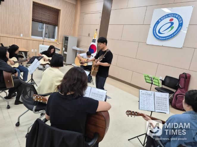 미담타임스 박민정 기자 | 충청남도서산교육지원청이 학부모들의 바쁜 일과를 고려하여 저녁 시간을 활용한‘마음토닥 통기타교실’을 운영하며 큰 호응을 얻고 있다.