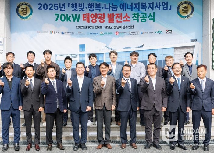 미담타임스 정인화 기자 | 10월 20일 오전 11시, 철원군 갈말읍에 위치한 철원군병영체험수련원에서 '햇빛·행복·나눔 에너지복지사업 70kW 태양광 발전소 착공식'이 열렸다. 이 행사에는 강원특별자치도 산업국장, 철원군수, 한국에너지공단 강원지역본부장, 한국기후변화연구원장, 그리고 강동에너지대표이사 등 5개 신재생에너지 관련 민간기업 대표가 참석했다.