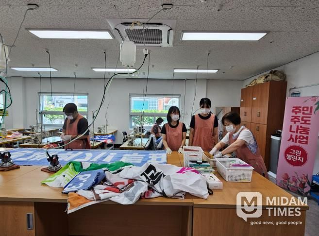 미담타임스 김준완 기자 | 서부종합사회복지관은 20일 지역주민들의 재봉기술 재능기부로 지난 대선 홍보용 폐현수막을 활용하여 마대자루 158개를 제작하여 울주군시설관리공단에 전달했다고 밝혔다.