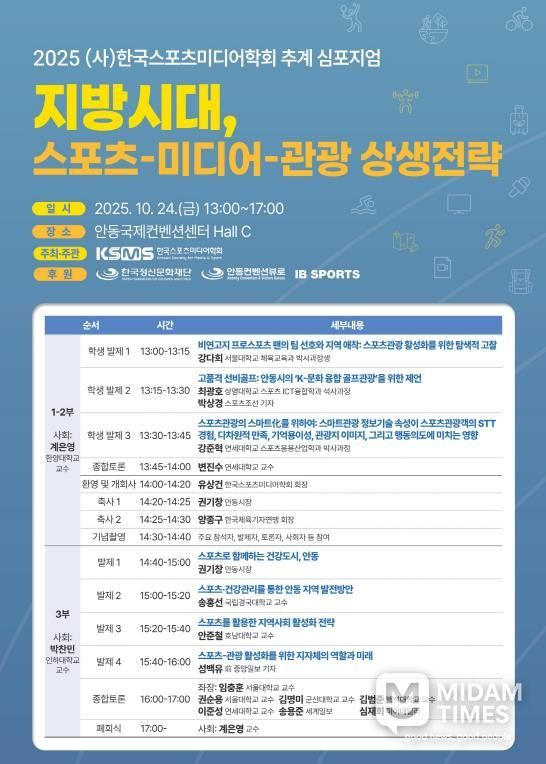 미담타임스 김준완 기자 | 한국스포츠미디어학회는 10월 24일 오후 1시부터 안동국제컨벤션센터에서 ‘2025 추계 심포지엄’을 개최한다.