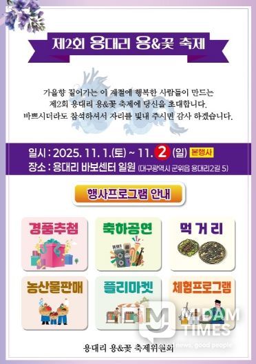 미담타임스 김준완 기자 | 용대리 마을회와 용대리 용&꽃 축제위원회는 오는 11월 1일부터 2일까지 이틀간, 용대리 마을회관 및 바보센터 일원에서 '제2회 용대리 용&꽃 축제'를 개최한다.