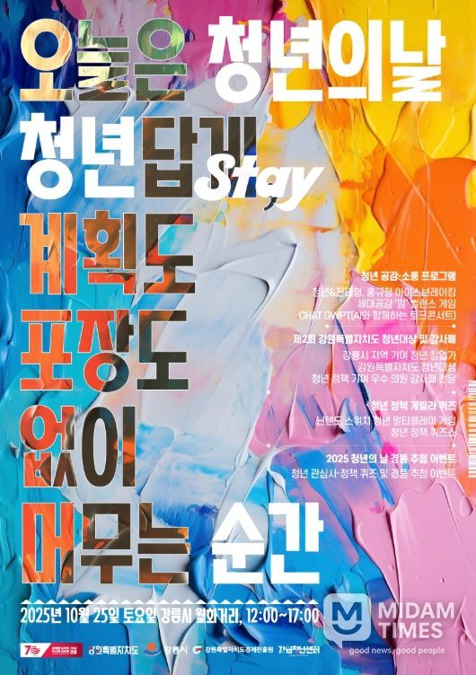 미담타임스 정인화 기자 | 강원특별자치도와 강릉시가 주최하는 2025 강원특별자치도 청년의 날 행사가 오는 25일 오후 12시부터 6시까지 강릉 월화거리(구한전 옆)에서 열린다.