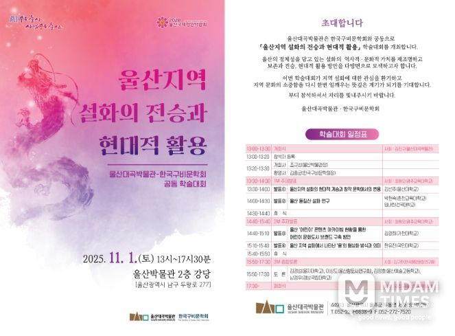 미담타임스 김준완 기자 | 울산대곡박물관은 오는 11월 1일 오후 1시 울산박물관 2층 강당에서 제13회 학술대회 ‘울산지역 설화의 전승과 현대적 활용’을 개최한다고 밝혔다.